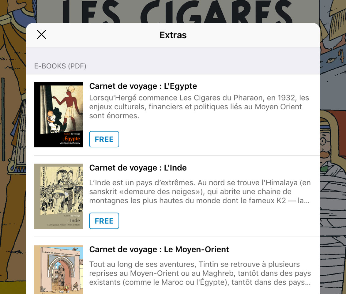Aperçus des nouveautés de la version 3.0 iOS (la version Android comporte pour l'instant moins de fonctionnalités) : - Nouvelle ergonomie et optimisation du poids de l’app (stockage moindre). - Meilleure gestion des contenus numériques (activation & désactivation). - Meilleure résolution et optimisation pour l'iPad Pro 12,9". - Offre freemium combinant accès libre à des contenus et accès payant aux albums. - Extraits des albums proposés pour un aperçu. - Offre de nouveaux add-ons (films documentaires + nouveaux audios liés aux albums). - Nouveaux fonds d'écrans et nouvelles figurines pour décorer la bibliothèque. - Version anglaise des albums des Aventures de Tintin jusqu’au titre Objectif Lune. - Version japonaise des 24 albums des Aventures de Tintin. - Version néerlandaise des 11 albums Quick & Flupke. - Version espagnole - deux albums disponibles sous forme d’add-ons.