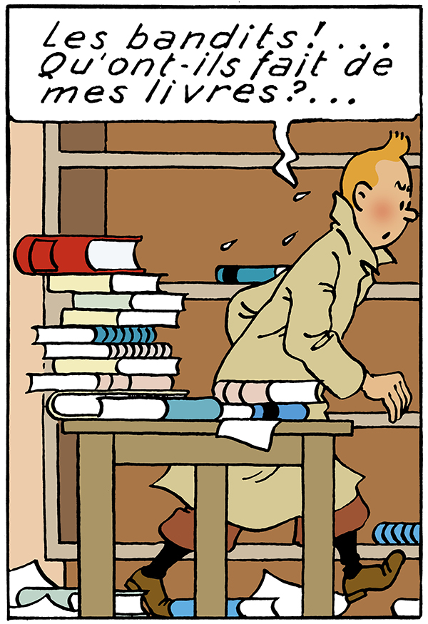 Les livres sont très importants pour notre héros. Le lecteur découvre que Tintin possède une bibliothèque bien fournie d’ouvrages aussi nombreux que variés. D'ailleurs, quand il découvre que son appartement a été cambriolé au début du Secret de la Licorne, il est catastrophé. La première chose qui l’inquiète, c’est l’état de ses livres.
