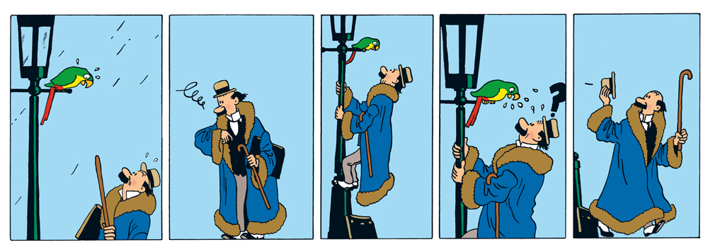 Ce professeur distrait fait une apparition tout à fait surréaliste et remarquable même si furtive. Il apparaît dans un double « strip » comme pour annoncer la venue de Tournesol. Sa distraction prend des proportions qui dépassent l’entendement ! Monsieur Euclide sort vêtu d’une robe de chambre ornée de fourrure ainsi qu’il sied à une personne de son rang. Il avait cru prendre son parapluie au design intemporel très british…mais de nouveau son étourderie lui joue des tours ! Le point culminant de son apparition est sa rencontre avec un perroquet en haut d’un réverbère ! Le dialogue qui en découle est un bijou à la simplicité trompeuse... Avec Hergé, la conversation devient un art !