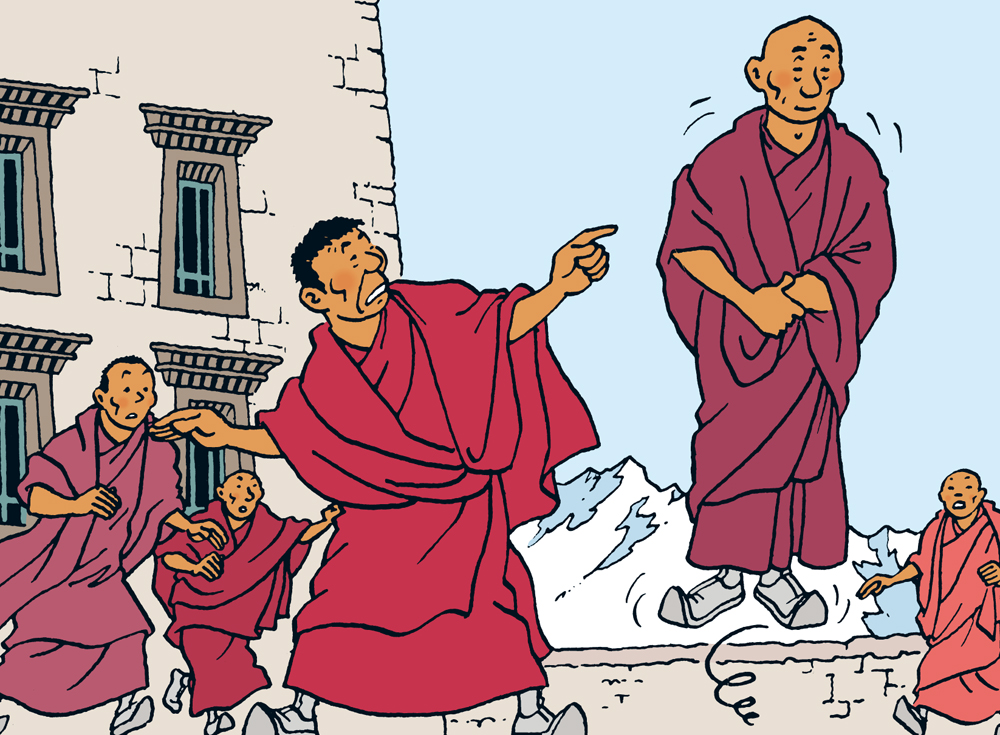 La particularité originale de Foudre Bénie, c’est qu’il lévite lors de ses visions et qu’il n’en a ensuite aucun souvenir. Un détail qui l’exonère d’être un escroc qui utiliserait ses « dons » pour en tirer profit, comme l’ont fait de nombreux illusionnistes pour faire croire à la capacité de s’affranchir de la loi de la pesanteur. Foudre Bénie n’est pas un personnage envahissant : il apparaît dans dix-sept cases en tout. Dix-sept ? Ce serait sans compter une dernière apparition un peu mystérieuse et cryptique, qui échappe au lecteur trop rapide. À la dernière page du récit, il ne distingue pas nécessairement qu’à la première case, au-dessus des murs de la lamaserie, un moine prend son envol. Certes, c’est presque indiscernable. Mais c’est certain : c’est la quatrième vision de Foudre Bénie…